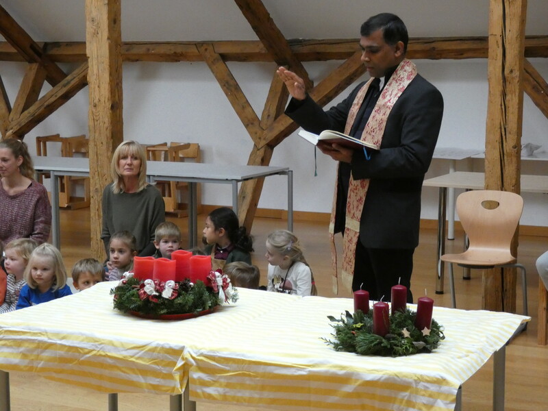 Einige Kinder der 4. Klasse erzählten uns etwas über den Advent und den Brauch rund um den Adventkranz und die vier Kerzen. Im Anschluss segnete unser Pfarrer Pater Josef die Kränze und sprach mit uns ein Gebet.