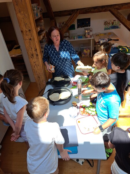 Im Zuge dessen wurden Chapatis (das traditionelle, indische Fladenbrot) selbst gebacken und mit Gemüse, Joghurt und Chutney verspeist. Beim Kneten, Rollen, Kochen, Riechen, Schmecken kamen alle Sinne und Elemente des sozialen Lernens zum Einsatz.