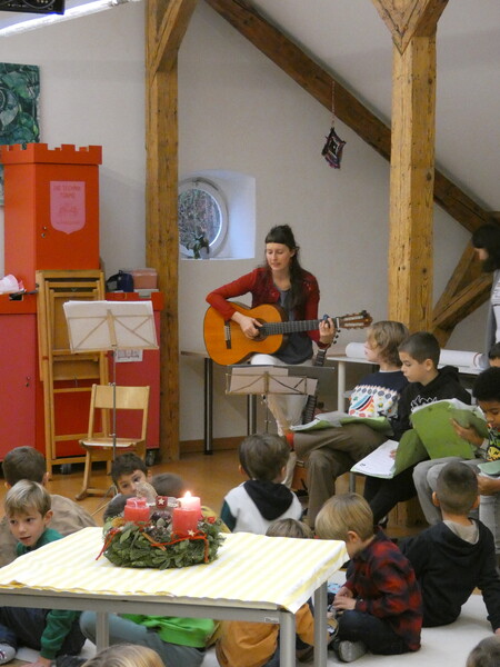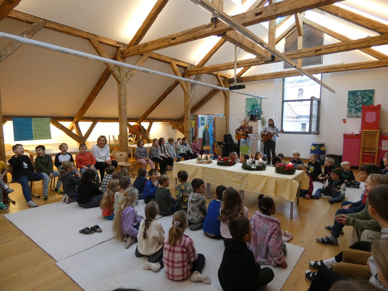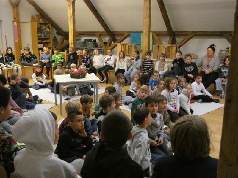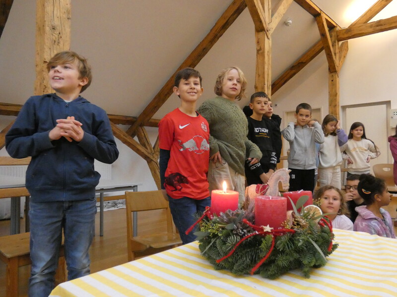 Unser Pfarrer Pater Josef betete mit uns und segnete die Kränze, dann wurde die erste Kerze entzündet. Dazu sangen wir gemeinsame Adventlieder, einzelne Klassen hatten eigene Beiträge vorbereitet und manche Kinder spielten sogar einzeln auf ihren Instrumenten vor.